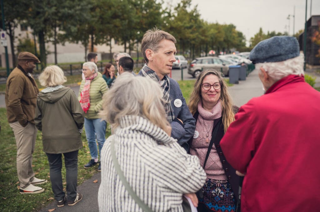 Après un porte à porte qui a permis de rencontrer et d’échanger avec les habitants de la Plaine du Moulin à vent, Julien Favre et Xaviera Marchetti ont participé avec des membres de leur comité de campagne à un café citoyen près de l’école Jules Verne.